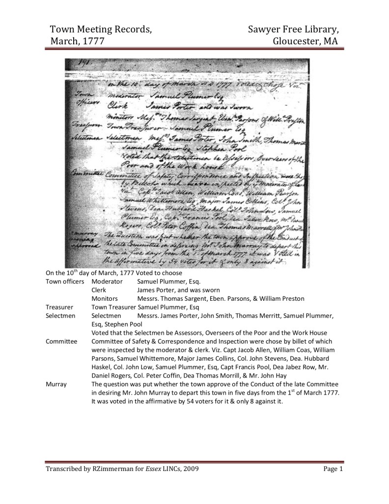 Town Meeting Minutes, (March 10, 1777). Sawyer Free Public Library, Gloucester, MA