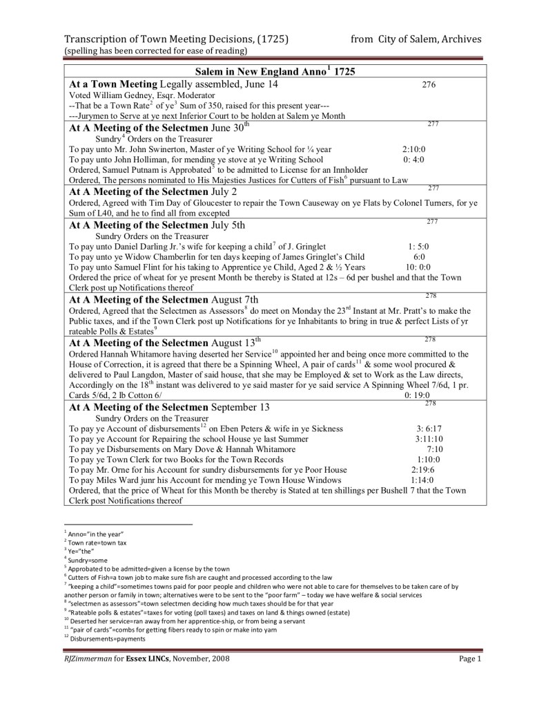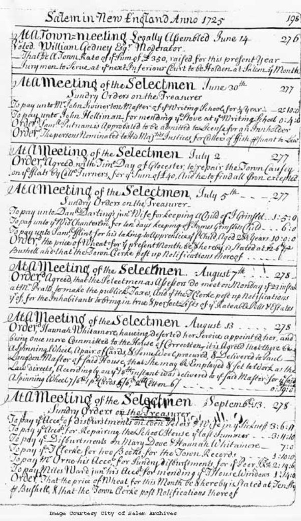 Town Meeting Decisions (1725). The City of Salem Archives, Salem, MA.