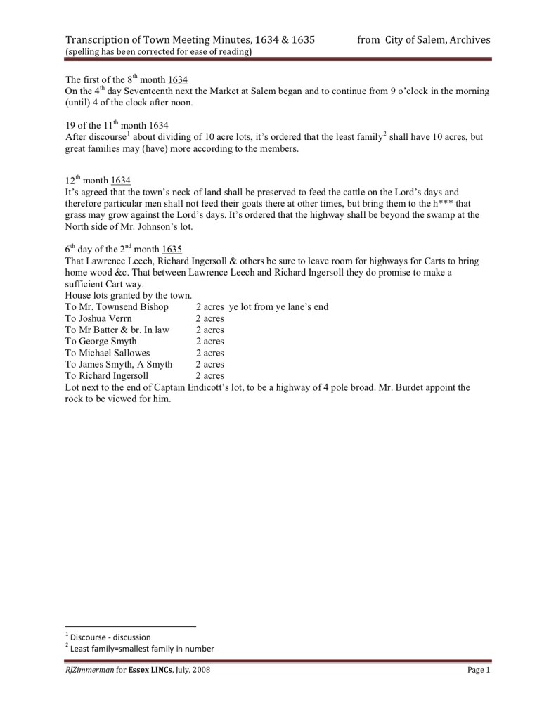 Town Meeting Minutes, 1634 and 1635. City of Salem Archives, Salem, MA.