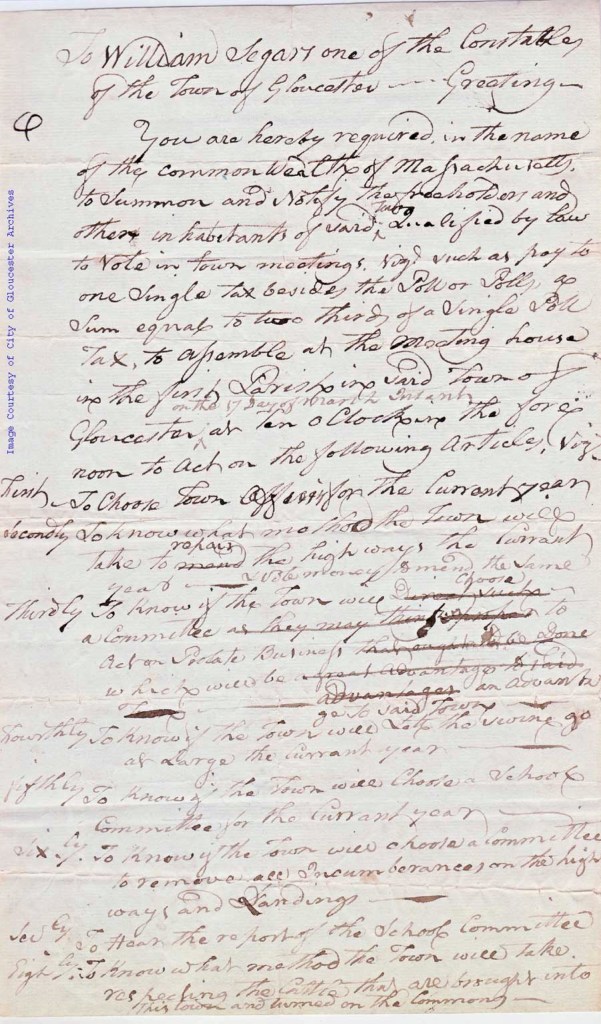 You are hereby required in the name of the Commonwealth of Massachusetts to Summon and Notify the freeholders2 and other inhabitants of said town Qualified by law to Vote in the Town Meetings. Viz3. such as pay to one single tax besides the Poll4 or Polls a Sum equal to two thirds of a Single Poll tax, to Assemble at the Meetinghouse5 in the first Parish in said Town of Gloucester on the 17th Day of March Instant at Ten O’clock in the forenoon to act on the following articles, viz.