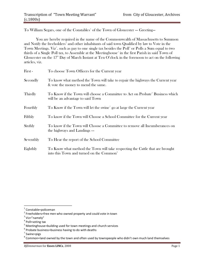 Town Meeting Warrant, (c. 1800s). Gloucester City Archives, Gloucester, MA.