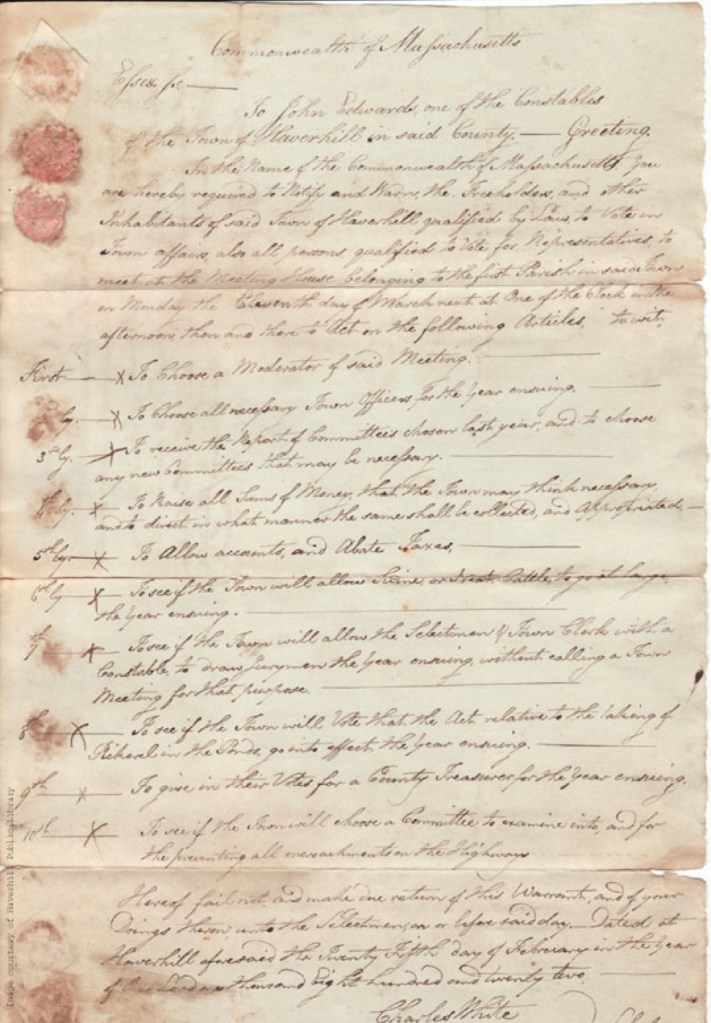 Haverhill Town Warrant, 1822. The Haverhill Public Library, Special Collections, Haverhill, MA.