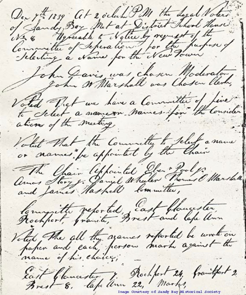 Sandy Bay voted in 1839 to consider separating from the Town of Gloucester and re-naming itself. This document outlines the procedure and the outcome of the naming of “Rockport” as a new town in Essex County.