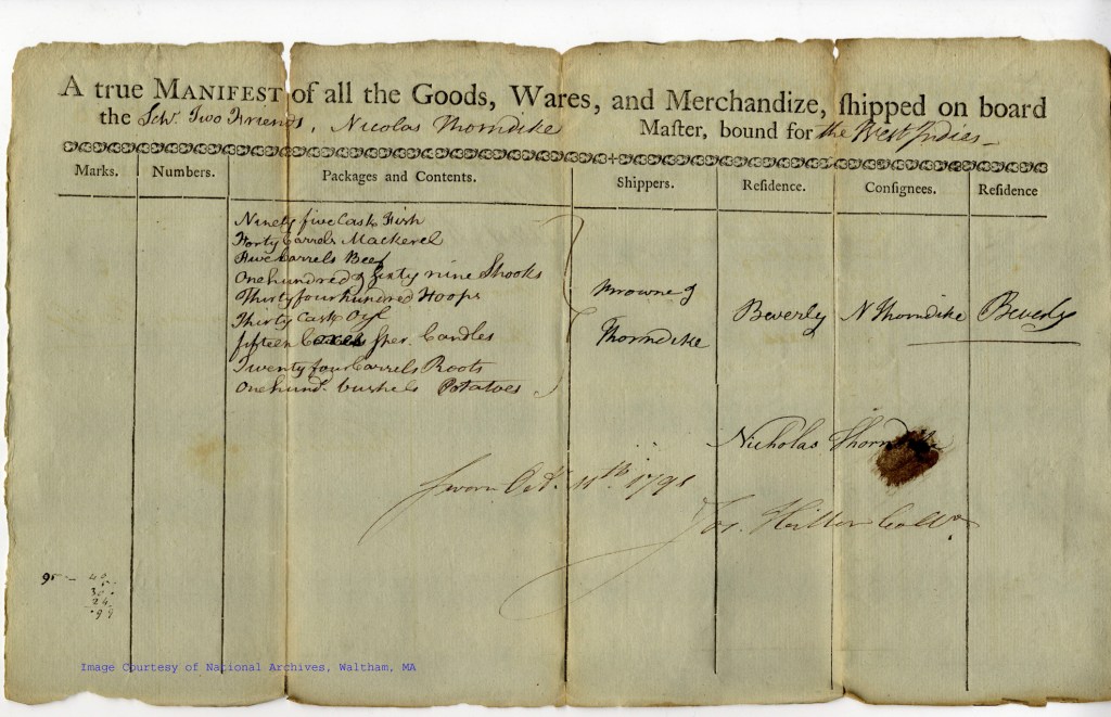 A true MANIFEST of all the Goods, Wares and Merchandize, shipped on board the Sch.1 Two Friends, Nicholas Thorndike, Master, bound for the West Indies