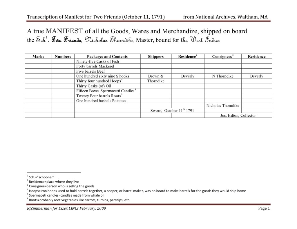An Outward Manifest lists the items that are being transported out of a port for sale somewhere else. This manifest shows that the Two Friends was bringing a cargo of fish, beef, S hooks, hoops, oil, candles, and vegetables to the West Indies.