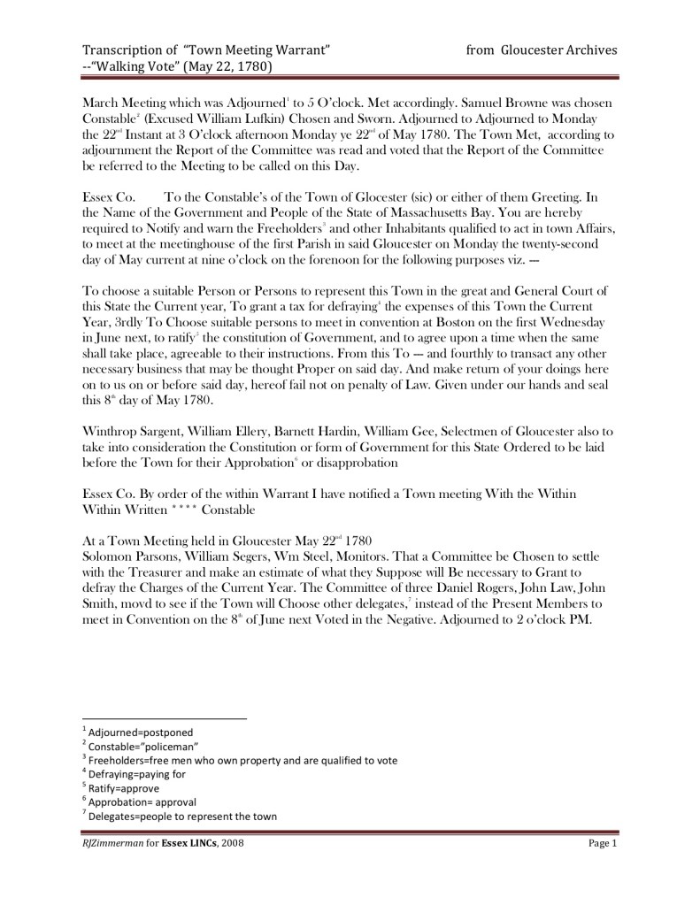 “Walking Vote”, Town Meeting Warrant (May 22, 1780), The Gloucester Archives, Gloucester, MA.