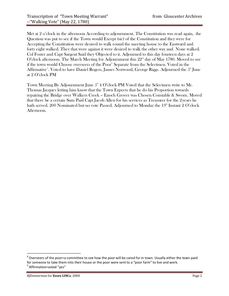 Met at 2 o’clock in the afternoon According to adjournment. The Constitution was read again, the Question was put to see if the Town would Except (sic) of the Constitution and they were for Accepting the Constitution were desired to walk round the meeting house to the Eastward and forty eight walked. They that were against it were desired to walk the other way and None walked. Col Foster and Capt Sargent Said they Objected to it. Adjourned to this day fourteen days at 2 O’clock afternoon. The March Meeting for Adjournment this 22nd day of May 1780. Moved to see if the town would Choose overseers of the Poor8 Separate from the Selectmen. Voted in the Affirmative9. Voted to have Daniel Rogers, James Norwood, George Riggs. Adjourned the 5th June at 2 O’clock PM