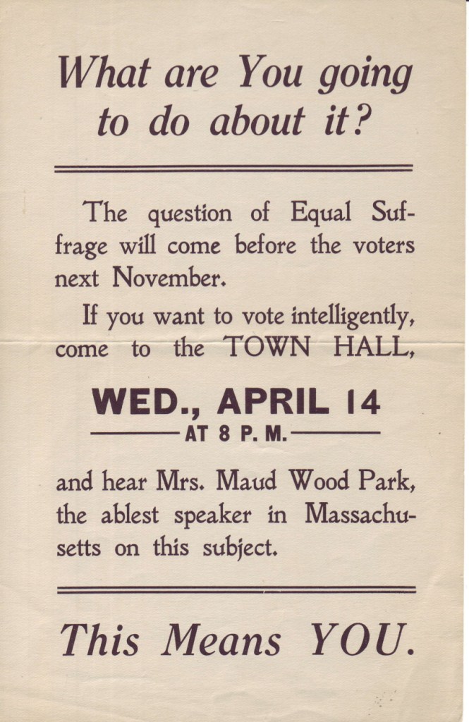 This undated flier asks voters to hear Maud Wood Park speak about women’s suffrage so that they can vote intelligently on the question of suffrage. Though undated, the flier is likely from 1915 when Massachusetts voted by referendum on the question of women’s suffrage.