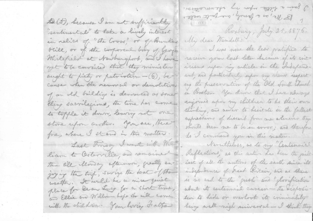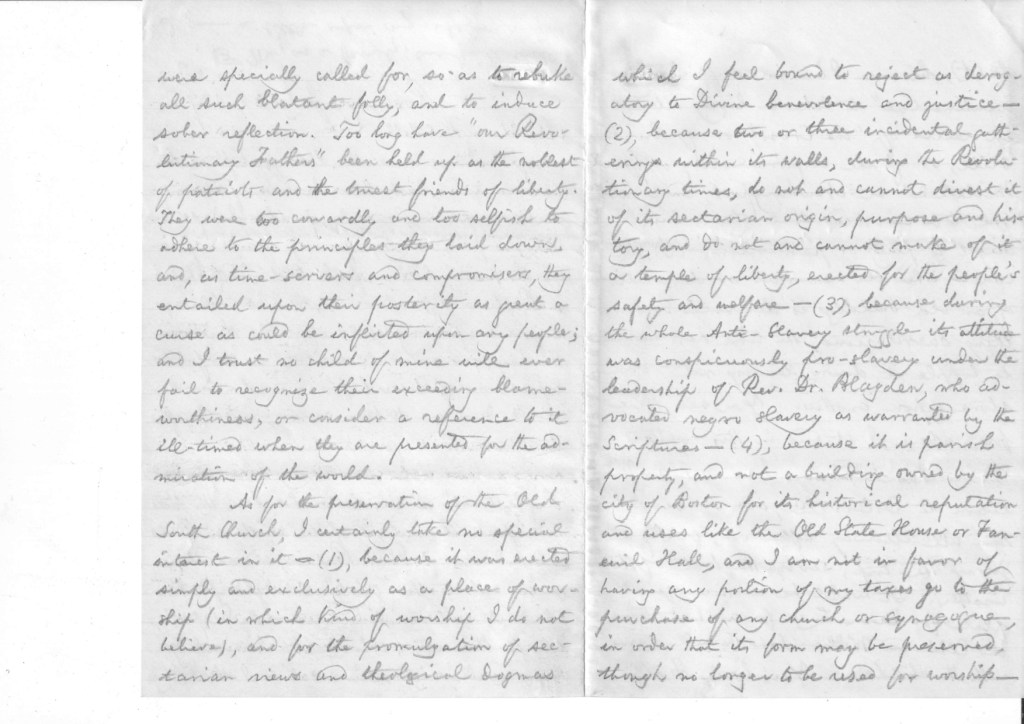 As for the preservation of the Old South Church, I certainly take no special interest in it – (1), because it was erected simply and exclusively as a place of worship (in which kind of worship I do not believe), and for the promulgation of sectarian views and theological dogmas which I feel bound to reject as derogatory to Divine benevolence and justice – (2), because two or three incidental gatherings within its walls, during the Revolutionary times, do not and cannot divest it of its sectarian origin, purpose and history, and do not and cannot make of it a temple of liberty, erected for the people’s safety and welfare – (3), because during the whole Anti-Slavery struggle its attitude was conspicuously pro-slavery under the leadership of Rev. Dr. Blagden, who advocated negro slavery as warranted by the Scriptures – (4), because it is parish property, and not a building owned by the city of Boston for its historical reputation and rises like the Old State House or Faneuil Hall, and I am not in favor of having any portion of my taxes go to the purchase of any church or synagogue, in order that its form may be presented, though no longer to be used for worship – (5), because I am not sufficiently “sentimental” to take a lively interest in relics of “the Cross,” or of Bunkers Hill, or of the corporeal body of George Whitefield at Newburyport, and I have yet to be convinced that they minister aught to piety or patriotism – (6), because when the removal or demolition of an old building is denounced as something sacrilegious, the time has come to topple it down, leaving not one stone upon another. You see, therefore, where I stand in this matter.