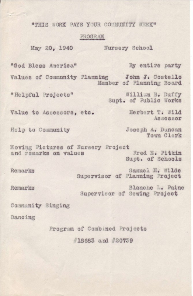 “THIS WORK PAYS YOUR COMMUNITY WEEK PROGRAM” (May 20, 1940). National Archives and Records Administration, Waltham, MA.
